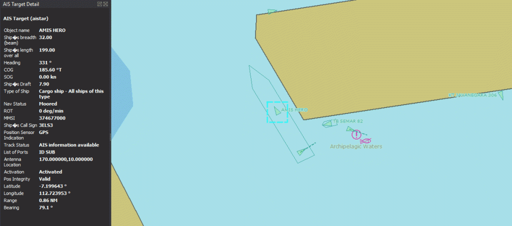 Get AIS Detail Data is an ECDIS function used to view detailed information from an AIS target, such as vessel name, MMSI, course, speed, and status.